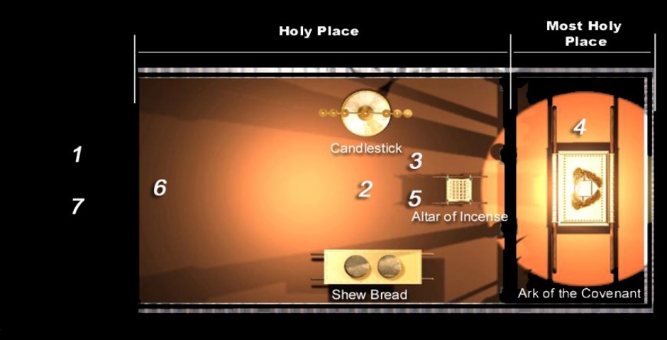 Notice there is a chiastic structure to this; 1 & 7 match, 2 & 6 match, 3 & 5 match, 4 is the apex and therefore the most important. The #4 you will notice is in the Most Holy Place of the Sanctuary where the High Priest alone went on the Day of Atonement.