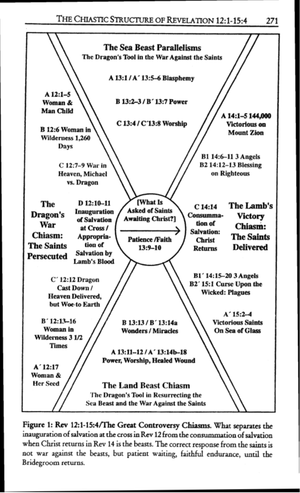 There are many chiasms in Revelation. There is a chiasm from Chapter 12 to 1.5 If you are interested in the detail of this chiasm you can view the entire dissertation by Dr William Shea here: https://digitalcommons.andrews.edu/cgi/viewcontent.cgi?article=2599&context=auss