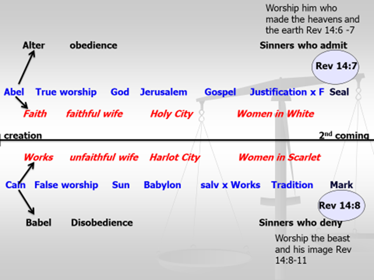 A diagrammatic summary of the Biblical narrative. Two threads have woven their way through scripture since the fall. Salvation by faith alone in the merits of the Lamb / Christ, or salvation by works – trusting in the lies perpetrated since Eden by the enemy. In Revelation 14 we will see that these produce 2 harvests; the wheat and the wine. Those who are trusting in the merits of Christ’s atonement alone (Justification by faith) are those who are sealed by the Holy Spirit. Those who are trusting in anything else but Christ, receive the mark of the beast. It’s the Abel and Cain story run throughout history, right until the last show down. Gen 4:15 – Cain received a mark. Ezekiel 9:4 God’s faithful remnant were marked in the forehead before the destruction of Babylon. Exodus 31:13 God’s people received a sign/seal of the covenant.