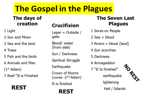 A quick overview of the 7 last plagues before the detail. As always everything in the Bible must be run through the prism of the cross. We have already noted that Revelation 15 & 16 stands opposite the 7 trumpets of Revelation 8-11 in the chiasm of the book. The trumpets had been partial judgments on the enemies of God’s people. Both the 7 trumpets and the 7 last plagues run the order of the days of creation backward. (see diagram from PPT presentation above and below.) This is de-creation!