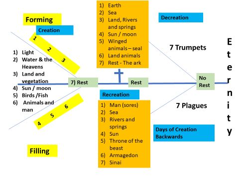 Is it not amazing that even Genesis 1 has a chiasm as it structure. Notice the diagram above: days 1-3 are the forming days, days 4-6 are the filling days.  So in the chiasm days 1 and 4 match, days  2 and 5 match and days 3 and 6 match. Have you ever been asked why the sun and moon come on day 4 when the light came on day 1. This is because the whole structure of the days of creation are pointing towards day 7. The seven trumpets and the 7 last plagues are running creation backwards. At creation there was a Sabbath Rest, At the Cross, Jesus rested in the tomb on the Sabbath as a memorial of our re-creation. But for those who worship the beast and receive the plagues, there is no rest (Revelation 14:11)